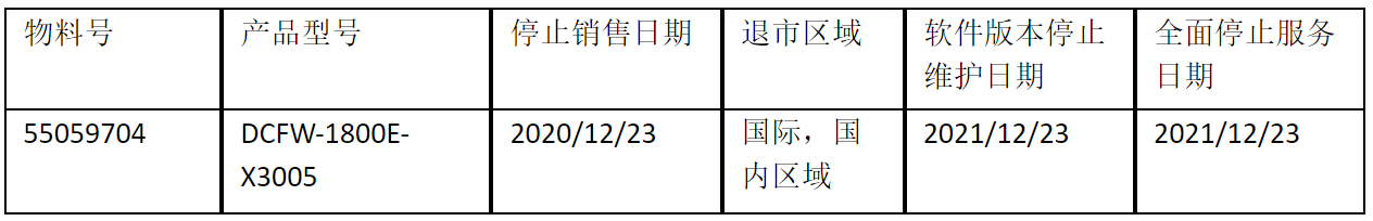 北京PA视讯官网数码云科信息技术有限公司正式通知您, 以上DCFW-1800E-X3005下一代防火墙(55059704)将于2020年12月23号停止接收新的订单(具体日期见上表),不再供货。给您带来的不便,敬请原谅。