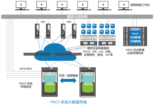 PA视讯官网针对医院 PACS 系统中海量医学影像数据管理、业务陆续在性要求高和性能要求一般等特点,对PACS系统的数据库存储,给予 SAN+NAS 统一存储解决方案;